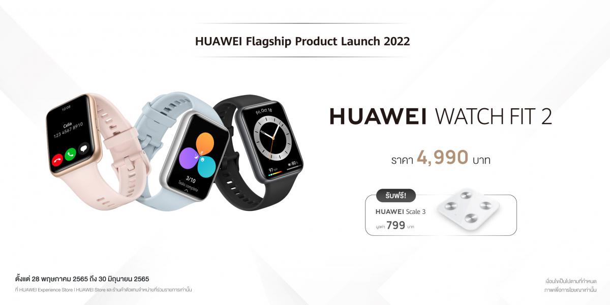 สมาร์ทวอทช์รุ่นขวัญใจมหาชน HUAWEI WATCH FIT 2 มีให้เลือก 3 สี ได้แก่ สีดำ Midnight Black, สีฟ้า Isle Blue และสีชมพู Sakura Pink ประกาศราคาวางจำหน่ายในประเทศไทยที่ 4,990 บาท พร้อมโปรโมชันพิเศษเมื่อสั่งซื้อสินค้าก่อนใคร รับฟรี HUAWEI Scale 3 มูลค่า 799 บาท ตั้งแต่ 28 พฤษภาคม 2565 ถึง 30 มิถุนายน 2565 ที่หน้าร้าน HUAWEI Experience Store และร้านค้าที่ร่วมรายการ รวมถึงช่องทางออนไลน์อย่าง HUAWEI Store และร้านค้าอย่างเป็นทางการของหัวเว่ยบน Shopee, Lazada, JD Central และ Thisshop และแอปพลิเคชัน My HUAWEI