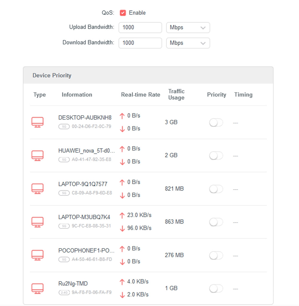 การกำหนด QoS ไม่มีอะไรยุ่งยาก กำหนดความเร็วค่าอัพโหลด/ดาวน์โหลดขั้นต่ำที่ต้องการให้เราเตอร์จดจำ จากนั้นเปิดใช้งาน ที่เหลือก็กำหนด Priority และระยะเวลาให้กับอุปกรณ์ที่เข้าเชื่อมต่อเราเตอร์ ความเร็วเหล่านั้นเป็นการการันตีให้ระบบเชื่อมต่อด้วยความเร็วขั้นต่ำตามค่าเหล่านั้น ไม่ใช่การกำหนดความเร็วให้กับไคลเอนท์ หากเน็ตบ้านคุณเร็วมากๆ และการจราจรไม่แออัดมันดูไม่ค่อยมีความจำเป็นเท่าไหร่