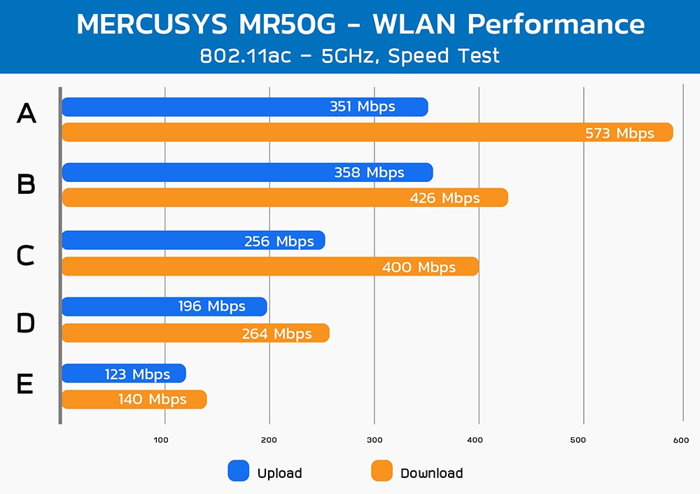 จากการวัดความเร็วด้วย Speed Test พบว่า ทุกๆ จุดทั่วบ้านหลังนี้สามารถใช้อินเทอร์เน็ตไร้สายผ่านเราเตอร์ MR50G ด้วยความเร็วขั้นต่ำ 200 Mbps สำหรับขาดาวน์โหลด ขณะที่จุด B หรือห้องนอนเป็นจุดที่เราเตอร์แบบใช้เสาสัญญาณแบบภายใน ต้องลำบาก แต่เราเตอร์ตัวนี้กับเสา 5dbi สามารถทำได้ความเร็วออกมาได้ดี แม้แต่จุด E ที่อยู่แนวรั้วบ้านแล้วมันก็ยังมีความเร็วที่ใช้งานได้สบายๆ และมีค่าลาเทนซี่อยู่ในช่วง 9 -11 ms