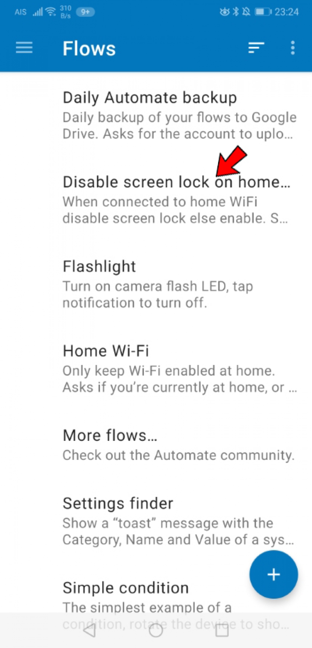 2. แตะเลือกรายการ ‘Disable screen lock on home wifi’ ในหน้าต่าง Flows