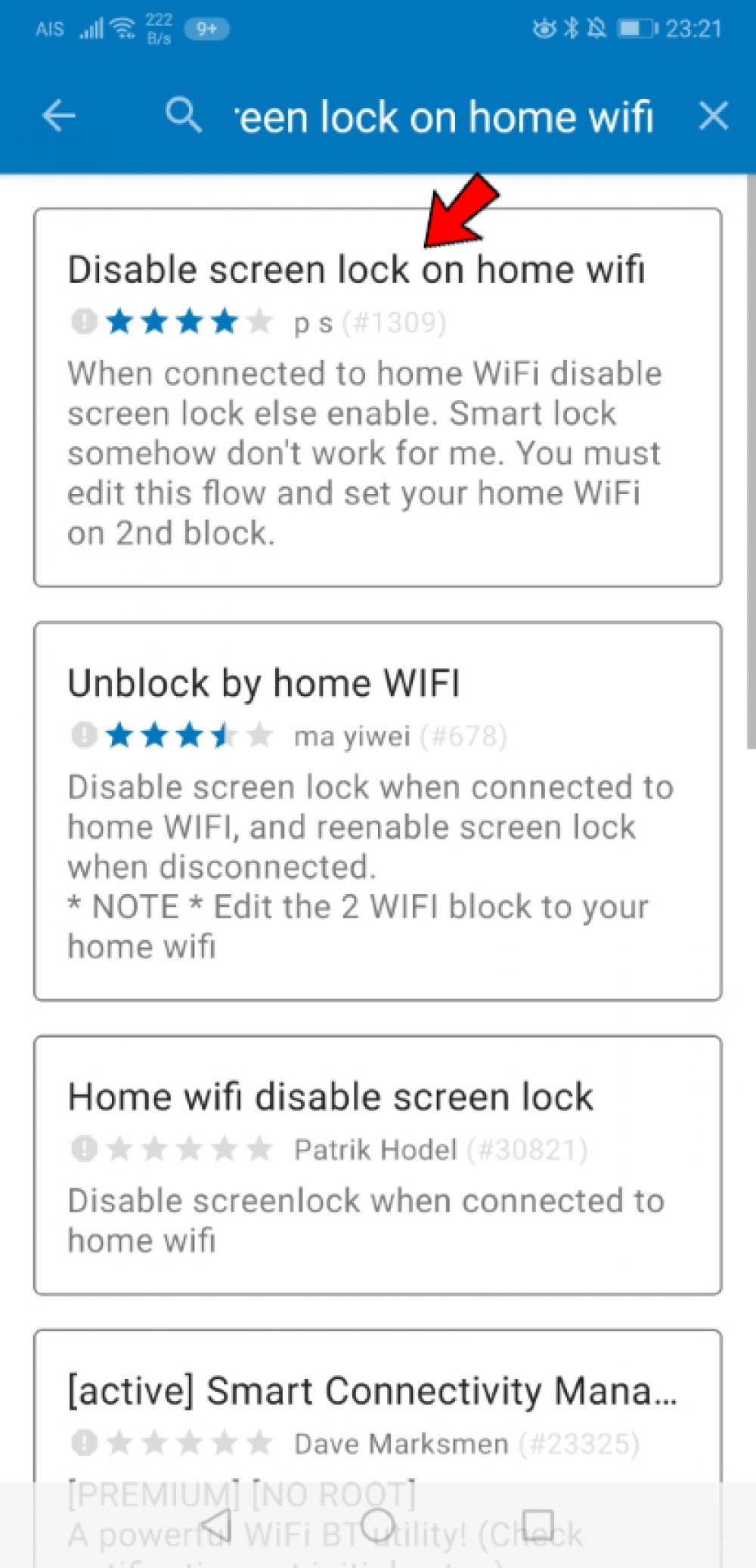 3. แอพจะพามายัง Community สำหรับการดาวน์โหลดโมดูลการทำงานเพิ่มเติม ให้แตะปุ่ม Search แล้วค้นหา ‘disable screen lock on home wifi’ แล้วแตะที่รายการค้นหาที่ปรากฏ (สังเกตจะมีชื่อยูสเซอร์ ‘P S’ ต่อท้าย)
