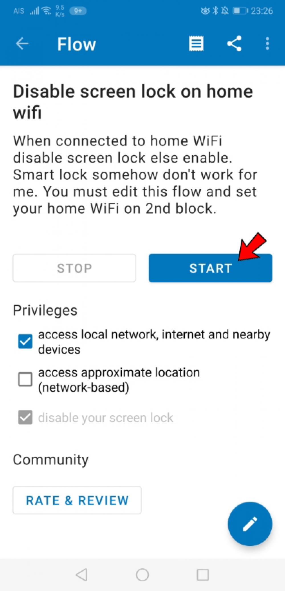 5. แตะปุ่ม ‘Save’ มุมบนขวา แล้วแตะลูกศรย้อนกลับไปยังหน้า Flow ของ ‘Disable screen lock on home wifi’ จากนั้นแตะปุ่ม ‘Start’
