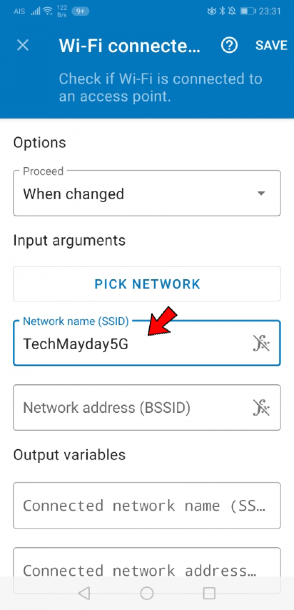 4. จะปรากฏไดอะแกรมแสดงขั้นตอนการทำงาน ให้แตะที่บล็อกที่สามจากด้านบน (When Wi-Fi connected) แล้วใส่ SSID ที่ต้องการใช้งาน (เช่น ชื่อ Wi-Fi ที่บ้าน) ในช่อง ‘Network name’ หรือจะเลือกชื่อ Wi-Fi จากปุ่ม ‘Pick Network’ ก็ได้